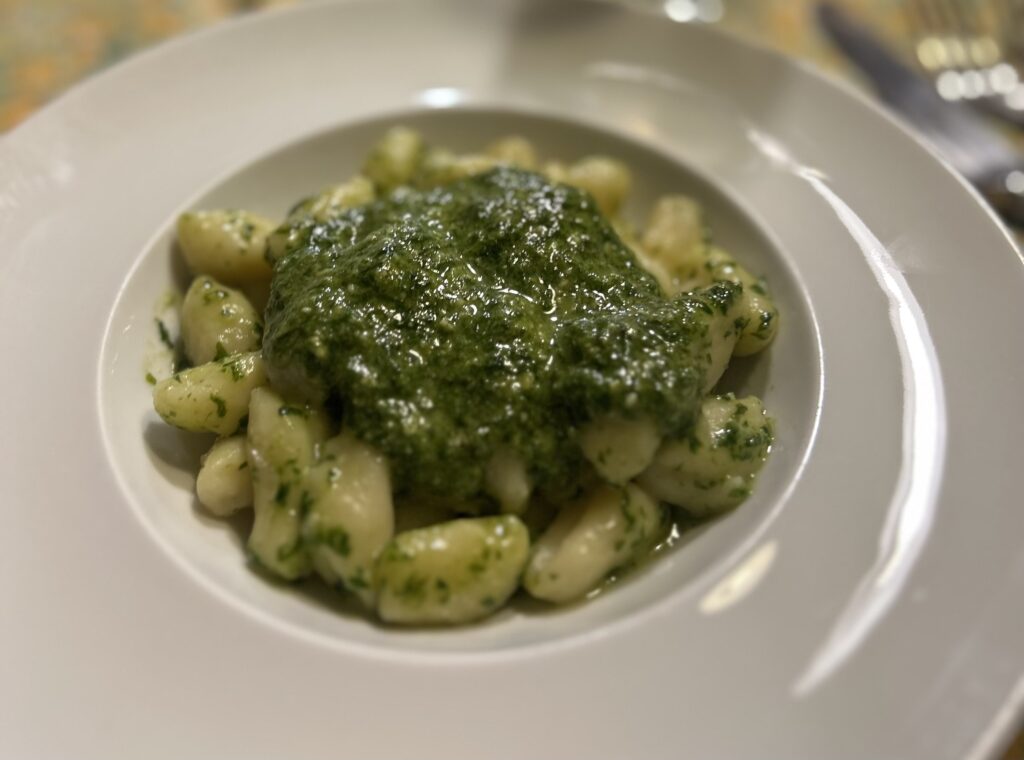 Wir wurden herzlich empfangen und es gab erst einmal ein große Portion Pesto, für das wir 4 wie Luca es mag uns einen Löffel teilten. Einfach Wahnsinn, so ein Pesto hatten wir wirklich noch nie gegessen. Danach gab es Gnocchi mit Pesto, Kutteln und seinen legendären Stockfisch mit Kartoffeln. Gianni Bruzzone zeigte uns seinen großen Mörser mit dem er jeden Tag das Pesto frisch zubereitet. Ganz stolz erzählt er uns, dass vor zwei Jahren Tim Mälzer mit einer 12 köpfigen Fernseh-Crew mit „Kitchen Impossible“ da war. Tim musste sein Pesto zubereiten, ohne Rezept, sondern nur nach seinem Geschmackssinn.