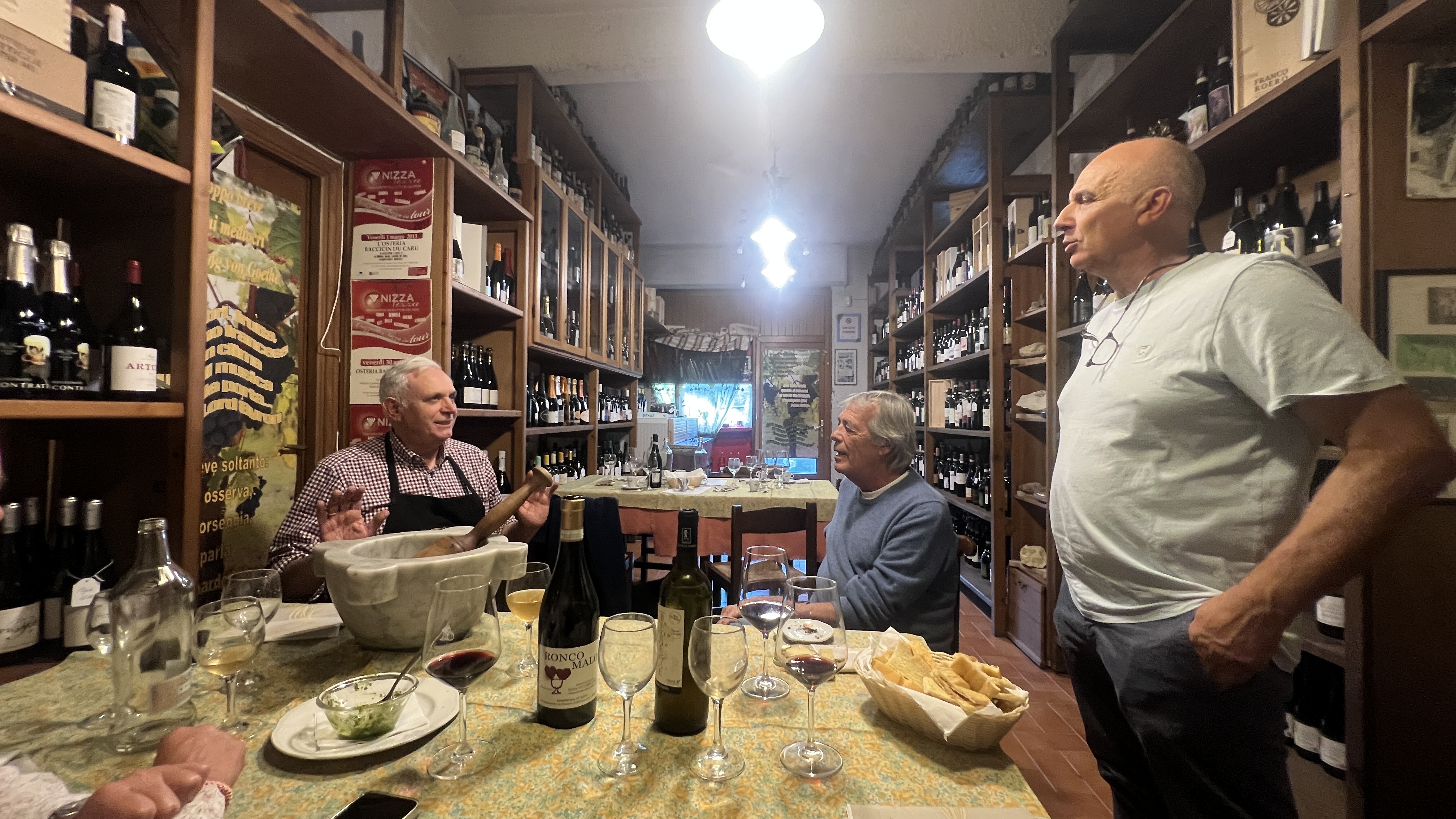 Nach einem Rum bei ihm im Büro, seinen legendären Hampden 1959, meinte Luca mit leuchtenten Augen: „Heute gehen wir etwas ganz Besonderes essen! Zu einem alten Freund von mir. Er macht das beste Pesto in ganz Italien. Als ich ihn angerufen habe, meinte er, dass sein Restaurant heute ausgebucht ist. Aber als ich ihn gebeten habe, dass ich unbedingt mit euch kommen möchte, meinte er dass er uns ein Platz neben an im Weinlager deckt, wo normalerweise nur die Familie ißt.“