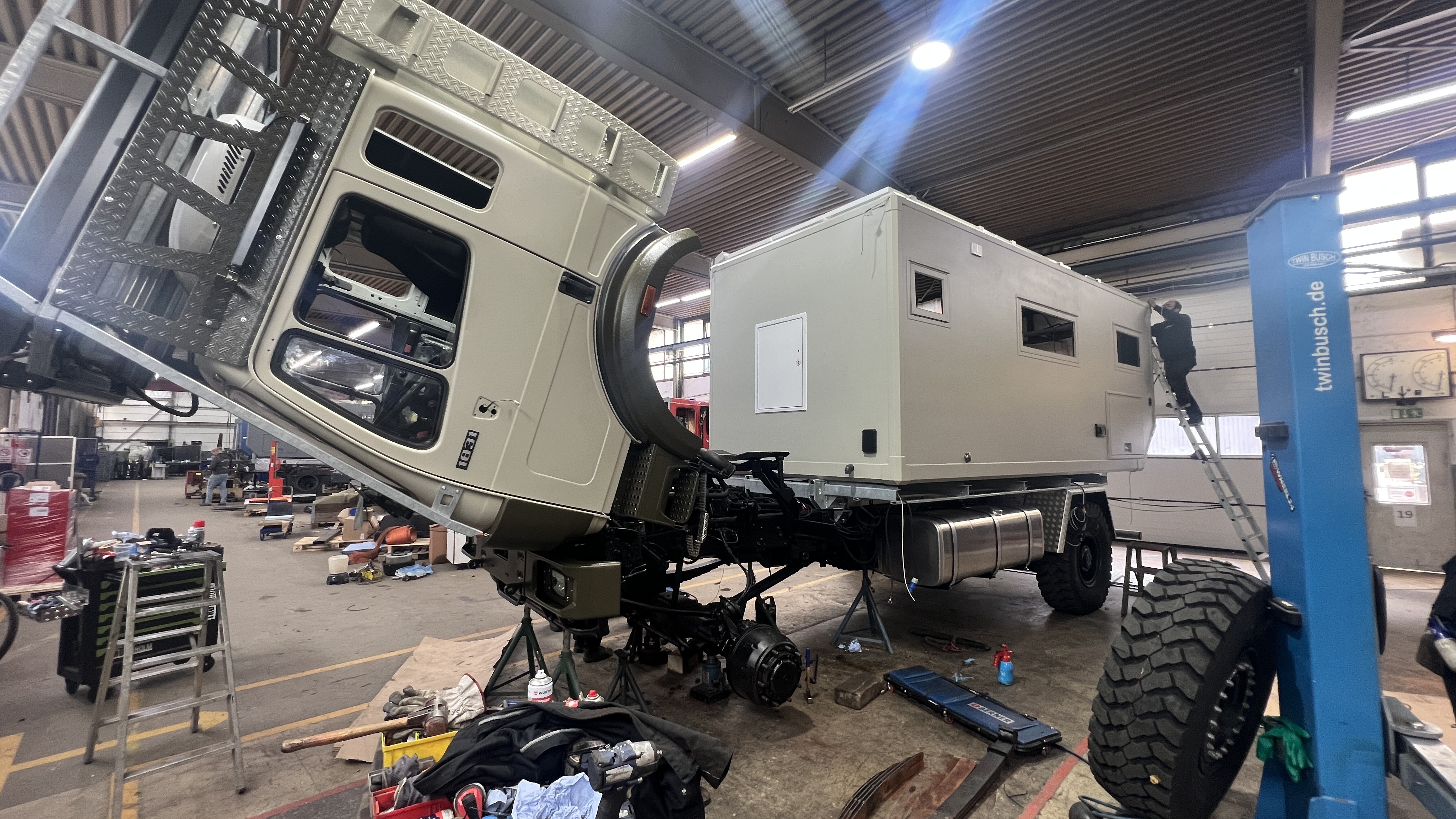 Im Januar sollte es dann bei 4wheel24 losgehen, es kam aber zu einer Vielzahl von Verzögerungen. Schlussendlich ging es dann im April los, aber auch gleich wieder mit einem Rückschlag. Im Hauptrahmen, der verlängert werden sollte, lag ein weiterer Rahmen und die beiden waren auch noch aus Panzerstahl. Dies sorgte für weitere Verzögerungen und führte dazu, dass wir ab Juli auf dem Fabrikgelände wohnten, in unserer Wohnkabine, die bereits fertig war. Das Ganze hatte den Vorteil, dass ich alle Kinderkrankheiten aus der Wohnkabine eliminieren konnte und den Fortschritt am Fahrzeug live verfolgen konnte.Im Oktober 2025 konnte unsere Reise endlich beginnen.