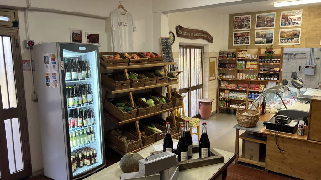 Wir haben eine ganze Woche hier verbracht und es sehr genossen. Unser ExMo Sir Gusto stand auf dem höchsten Punkt des Anwesens und wir haben unsere Terrasse in Richtung des im Tal liegenden Ortes ausgezogen. Täglich um Punkt 12.30 Uhr saßen wir am Mittagstisch – einer langen Tafel, an der bis zu 40 Personen Platz hatten. Die ganze Kommune ißt gemeinsam zu Mittag. Das Essen ist einfach, aber wir waren jeden Tag begeistert was auf den Tisch kam. Der erste Gang waren immer Nudel oder Risotto. Der zweite Gang war immer Salat mit fantastischen Kreationen was hier am Ort wächst oder geschlachtet wurde. Dazu gab es immer Wein vom eigenen Anbau, wovon wir immer eine Flasche zum Essen genossen haben. Anschließend gab es noch einen Nachtisch mit Espresso. Das ganze kostet 13,00 pro Person inklusive Wein – ich sage nur WAHNSINN.